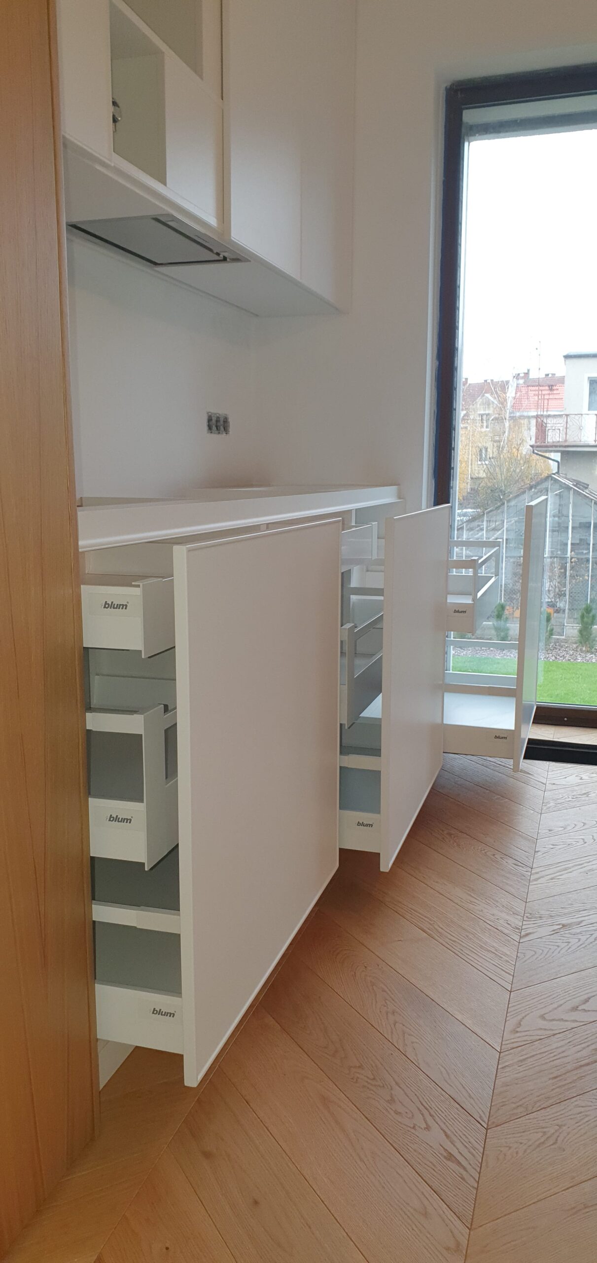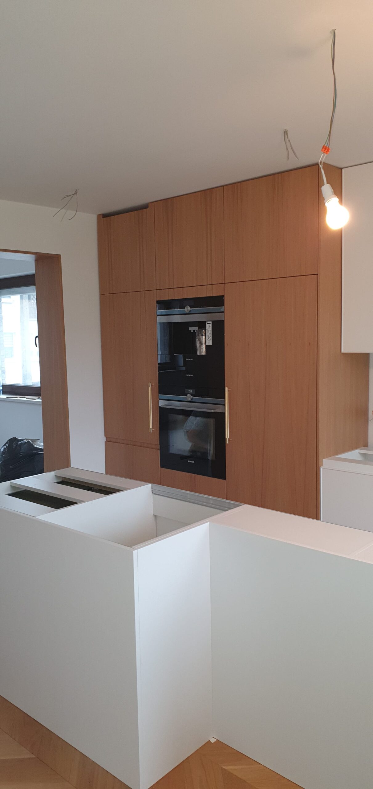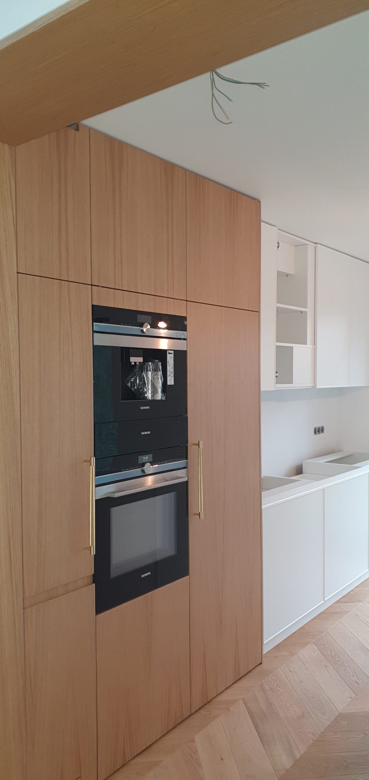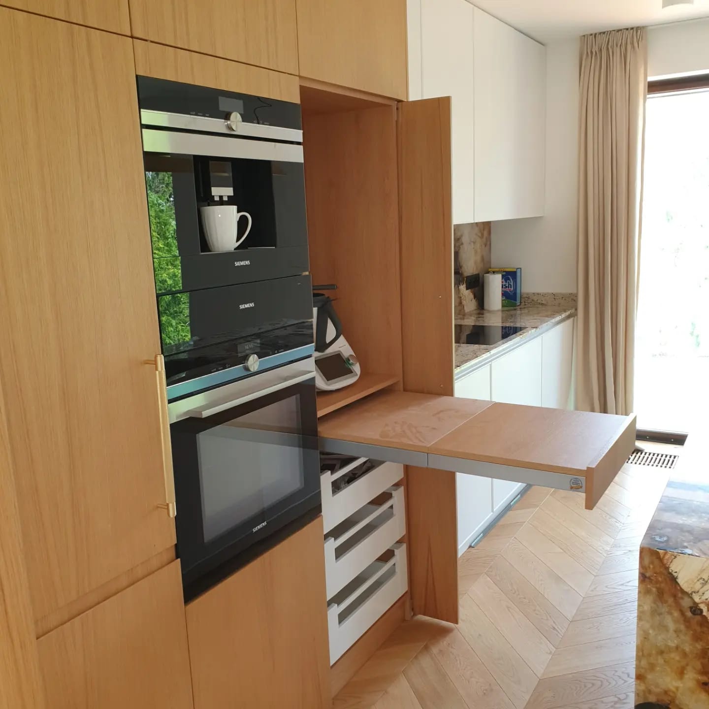 Eleganckie kominy kuchenne z naturalnej okleiny dębowej, lakierowane bezbarwnym lakierem. W sekcji nr 1 znajduje się lodówka, a w sekcji nr 2 – szuflady wewnętrzne firmy BLUM, piekarnik i ekspres do kawy. Sekcja nr 3 to front systemu HAVA z rozkładaną stolnicą, miejscem na Thermomix i produkty spożywcze w szufladach firmy BLUM. Dolna część oferuje trzy duże szafki z ukrytymi szufladami BLUM o różnych wysokościach. Wyspa jest lakierowana i frezowana, a w jej wnętrzu znajdują się zmywarka, kosze na odpadki, sortownik na śmieci oraz uzdatniacz do wody pitnej. Całość uzupełniają piękne blaty z kwarcu dostosowane na zamówienie.